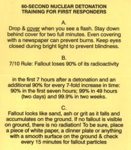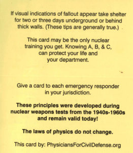 After the initial detonation, there might be fallout danger. Physicians for Civil Defense has equipped many first responders with expedient “dot monitors” to detect dangerous levels of radiation. The U.S. has no robust national fallout monitoring net, and the Cold War radiation monitoring instruments maintained by states were retired decades ago and not replaced.